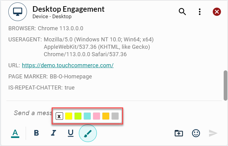 Text formatting enables the agent to bold, italicize, underline or highlight words(s) in the engagement. Unlike spell check, which is an automatic feature that activates once it recognizes a misspelled word, text formatting is controlled by the agent.
