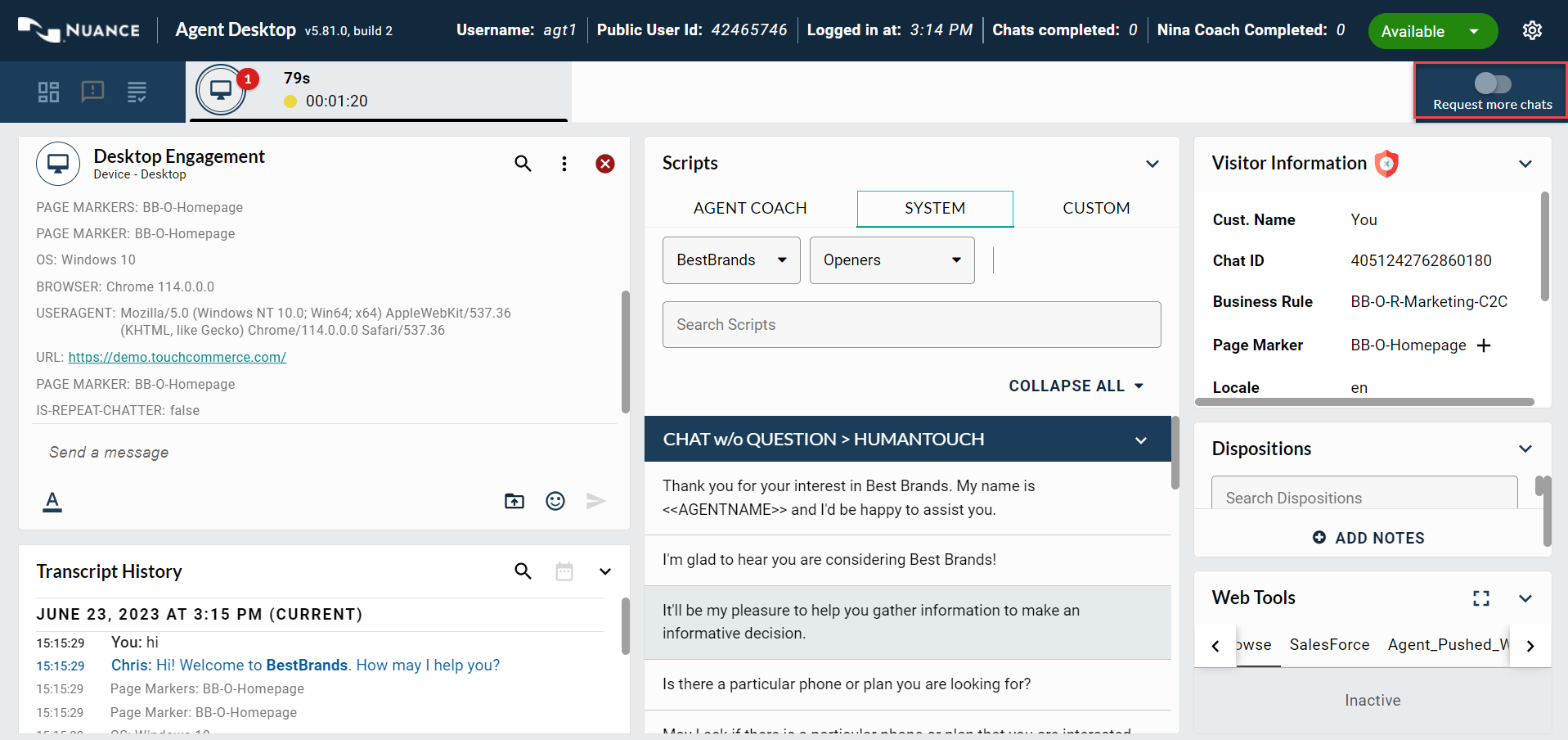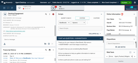 If the above conditions are met, the Request more chats toggle becomes active, enabling the agent to request additional engagements from the system queue.