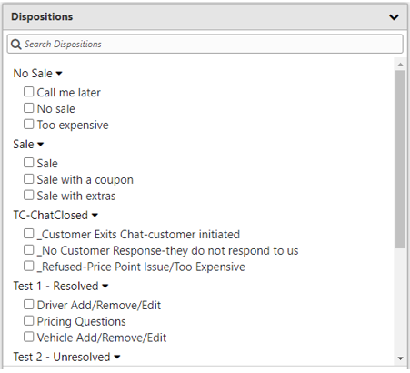 The search field runs a text filter on all of the disposition reasons and the disposition category names. If a disposition reason matches the search text, it will be shown in the filtered list under its corresponding disposition category even if the category itself does not match the search text.