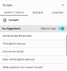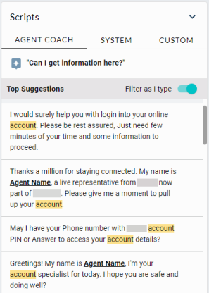 The Agent Coach top recommendations are filtered to display the scripts that contain the word “account” and highlights them for easy visibility. These recommended scripts are listed and ranked by confidence score.