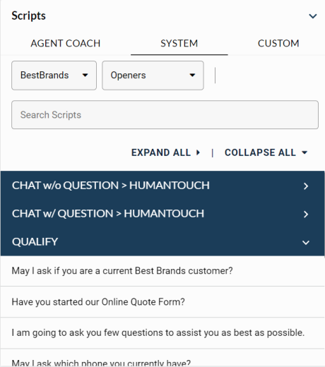 Headers provide a quick summary to the agent of the type of script lines housed under the header. Each header can be collapsed to hide the script lines if the agent no longer needs the script.