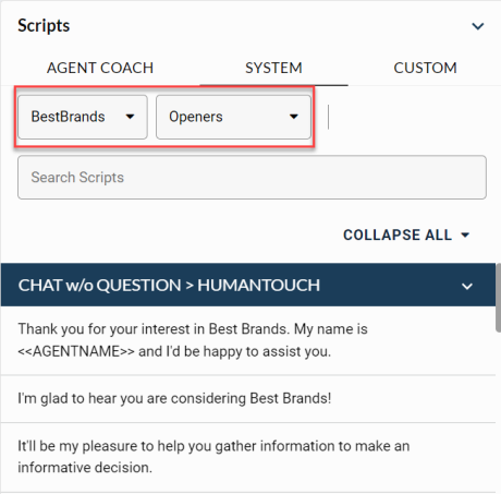 If the agent hovers over the italicized & dithered script, the “Script is unavailable” message will appear. This prevents the agent from using the recently ‘used’ script line again, to avoid sounding “robotic” in the conversation.
