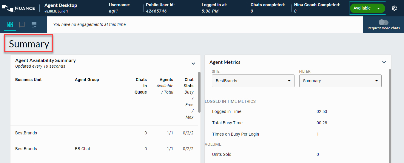 Agents can customize the Summary landing page by resizing the Metrics title and Agent Metrics windows based on their preferences.