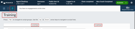 The Training tab enables an agent to access the project script library and the Custom Scripts (if enabled in the project) to review script menus, structure, and script lines to strengthen the script knowledge.
