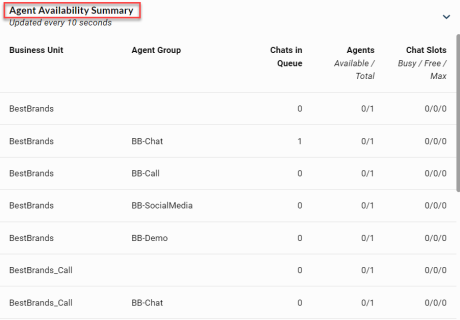 It provides details on the Business Unit, Agent Group, Chats in Queue, Total number of Agents Available, and Chat Slots. |