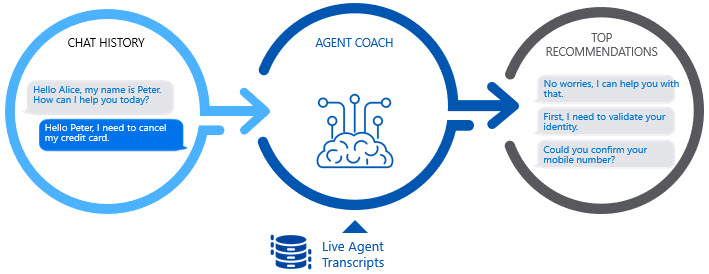 Under Agent Coach Management, agents can select and modify top recommendations suggested by the recommendation system. These recommendations are created by analyzing the current chat history and previous transcripts, leveraging prior responses to provide the most effective response suggestions.