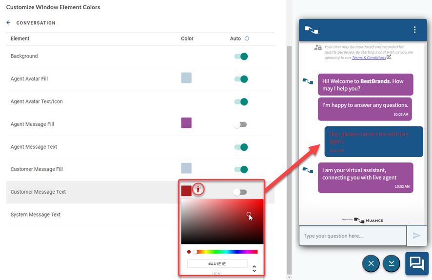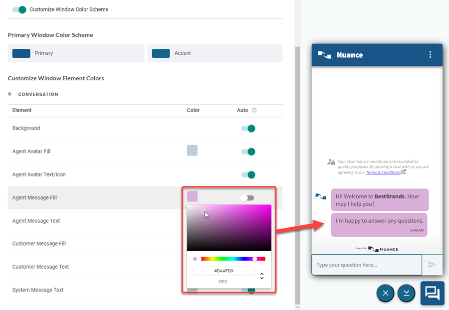 Customize Window Element Colors: Click on the individual components of the chat window to change colors in those areas. By default, each color setting is set to Auto, which ensures that each color for the component is automatically selected based on the Primary and Accent colors.