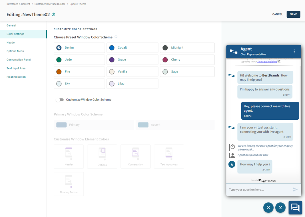 Choose Preset Window Color Scheme: Select from the different color schemes. Each theme contains a primary and accent color, which appears in the interactive chat window as you select the colors. These theme colors set the other colors that appear in the chat window.