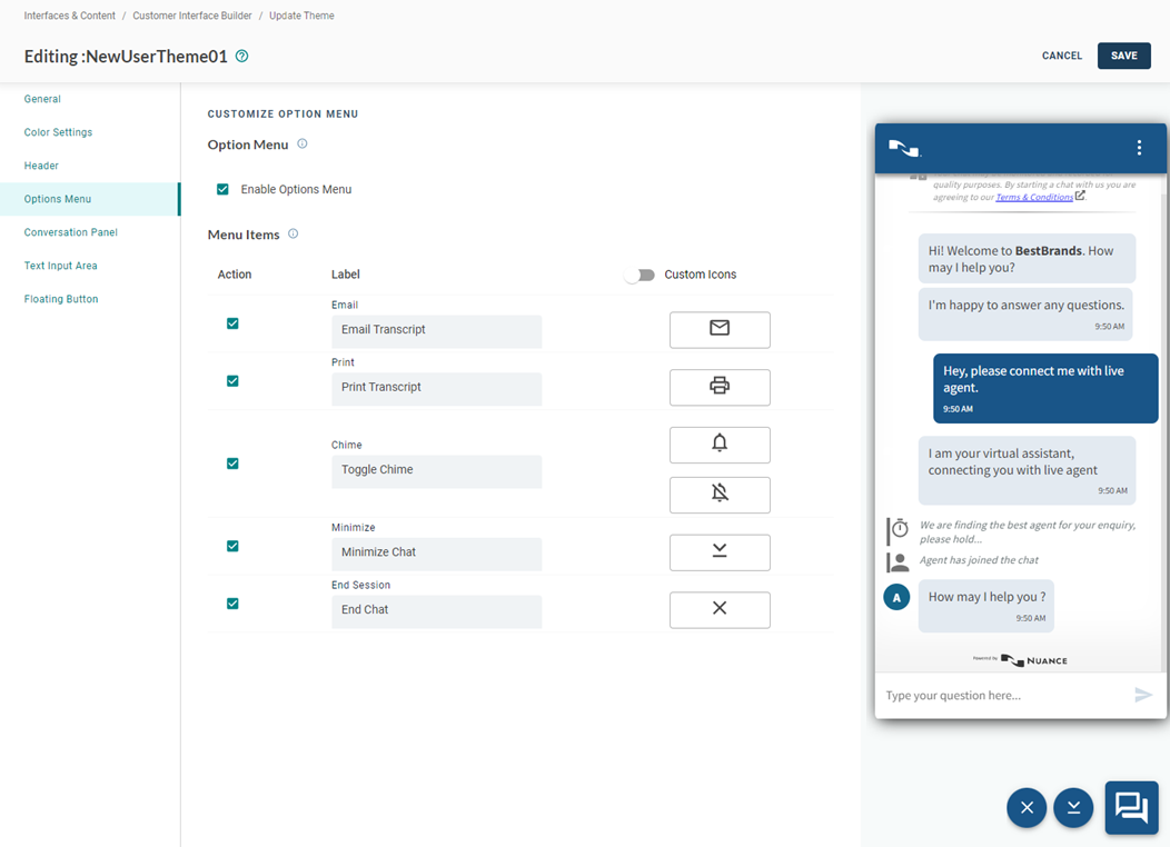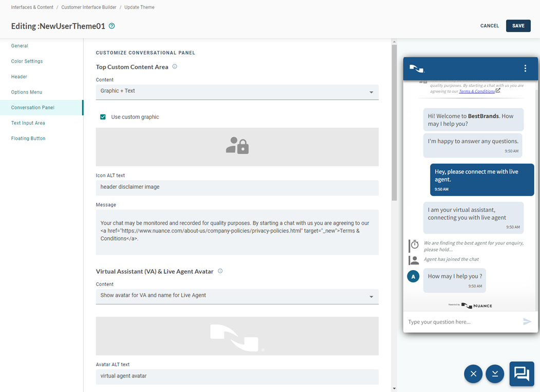 Content: Set as either Show avatar for VA and name for Live Agent (displays a graphic for the virtual assistant, and the first initial for the agent's name) or Show avatar for both VA and Live Agent (displays a graphic for both the virtual assistant and live agent).