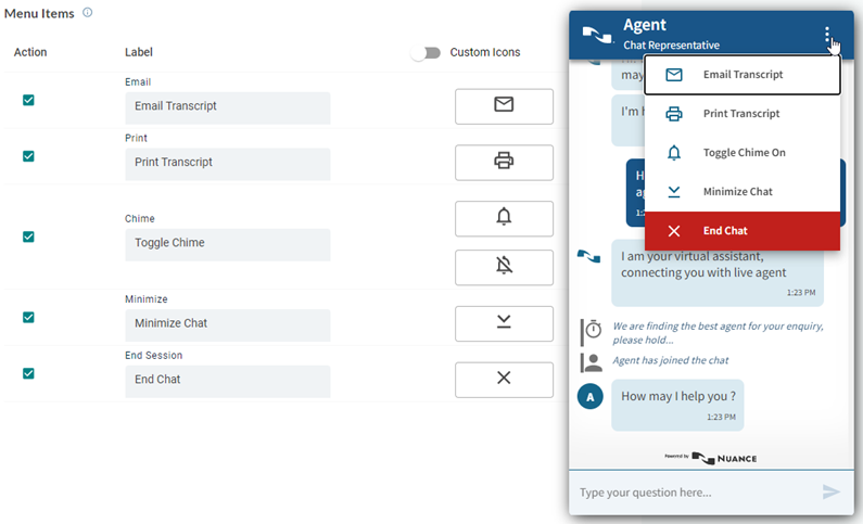 Menu Items: By default, all the sub-menu items are enabled, along with default descriptions for the labels and icons. Toggle Custom Icons to click on the icon and select from the preloaded options or upload your own icons.