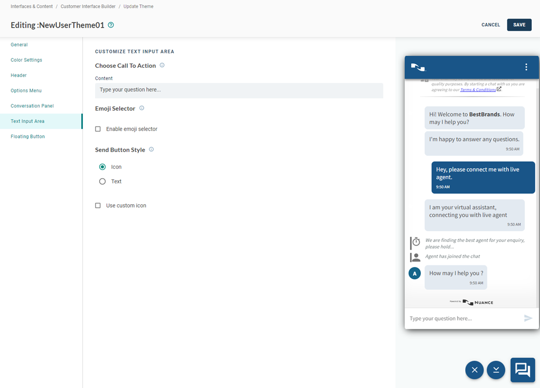 Send Button Style: Defines whether an icon or text will be used to indicate the send option on customer input messages.
