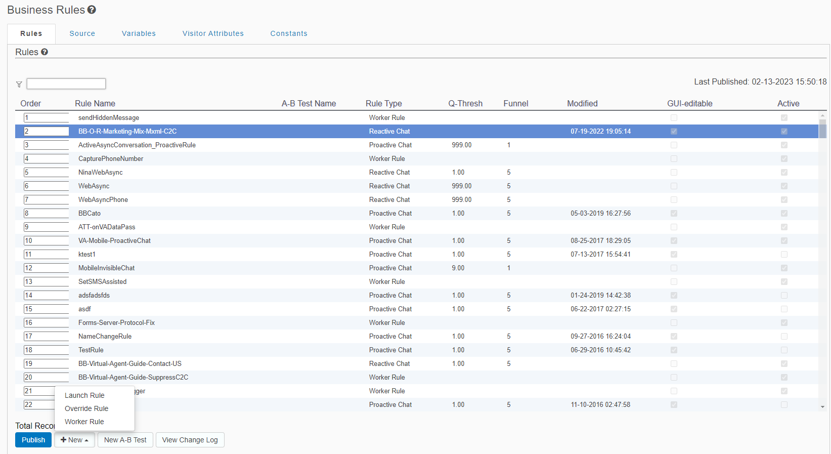 - Click Save. The Business Rules table displays in the A-B Test column. You can now edit each business rule individually.