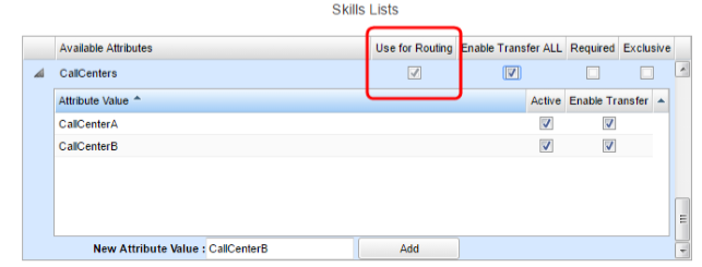 Attributes must have the Use for Routing box checked on the Engagement Skills page in order to qualify for a Routing Allocation Spec. If an attribute is used in a Routing Allocation Spec and later on the Use for Routing box is unchecked, the software will automatically deactivate the Routing Allocation Spec. (A warning message will display when the box is unchecked.)