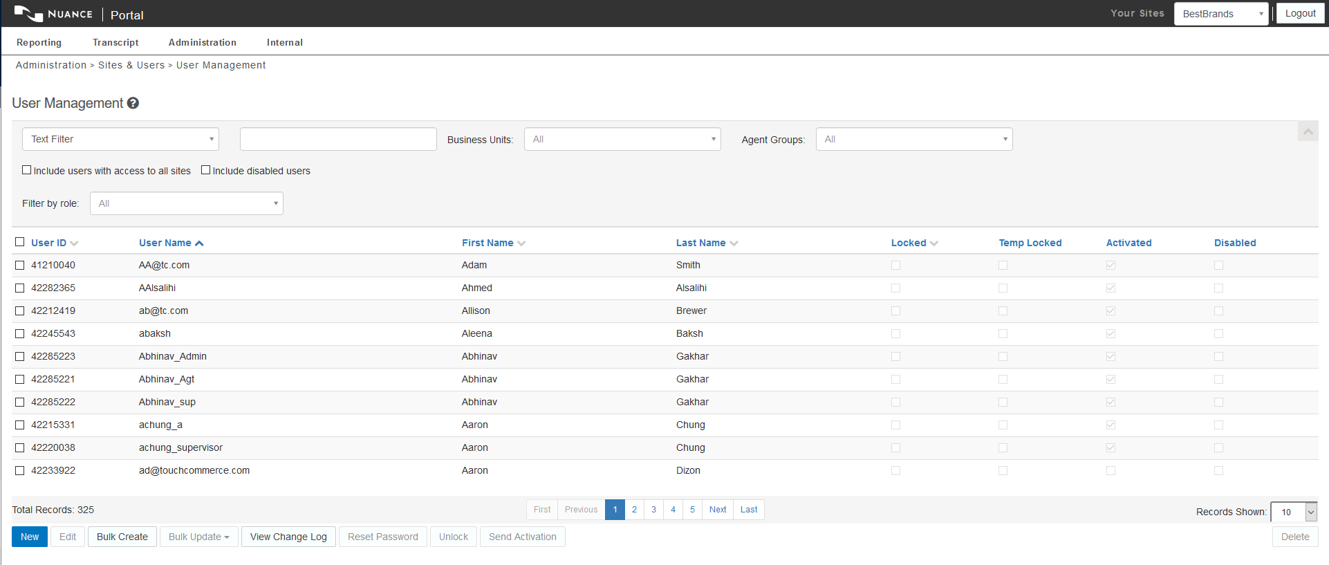 The Portal administrator must have credentials to grant all user roles listed in the template. Administrators can download a file that lists the user roles, Business Units and Agent Groups that they have permission to grant. Use the Click here link on the Bulk Create Users page in Portal.