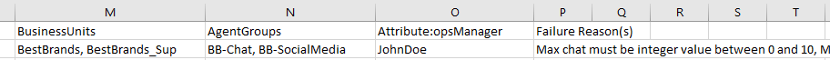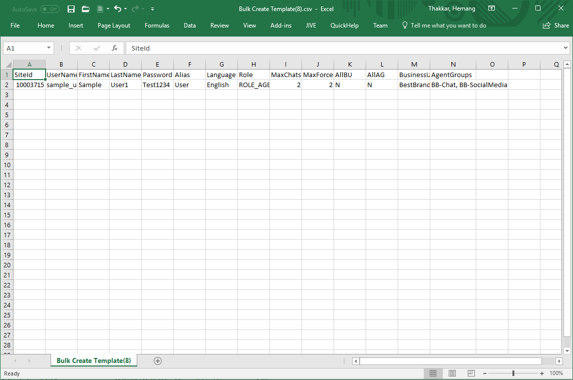 If the site has certain agent attributes marked as Required, they will be included in the template in the format AgentAttribute:ATTRIBUTE_NAME as separate columns for each required attribute. A value must be entered for each agent account being created. Additional attributes can be added to the template by creating additional columns in the format of AgentAttribute:ATTRIBUTE_NAME. |