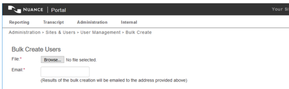 In Portal, navigate to Administration → Sites & Users → User Management → Bulk Create.