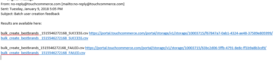 Once the bulk create process is complete, a notification will be sent to the email address entered on the Bulk Create page in Portal. The email contains two links. One displays a list of user accounts that were successfully created. The other displays a list of user accounts that had validation errors and thus were not created.