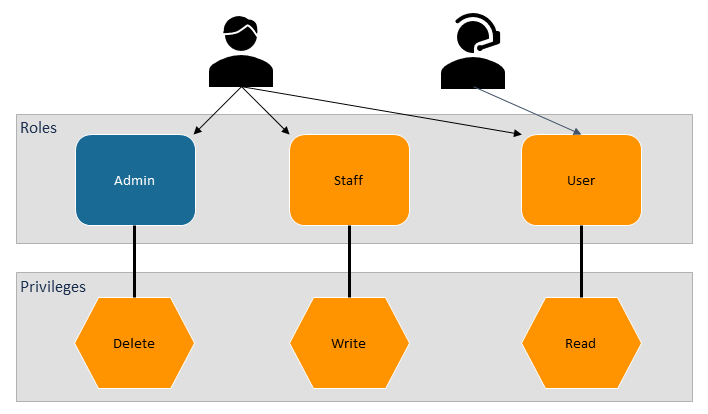 The relationship between users, roles and privileges is shown below. One user can have multiple roles, and one role can have multiple privileges.