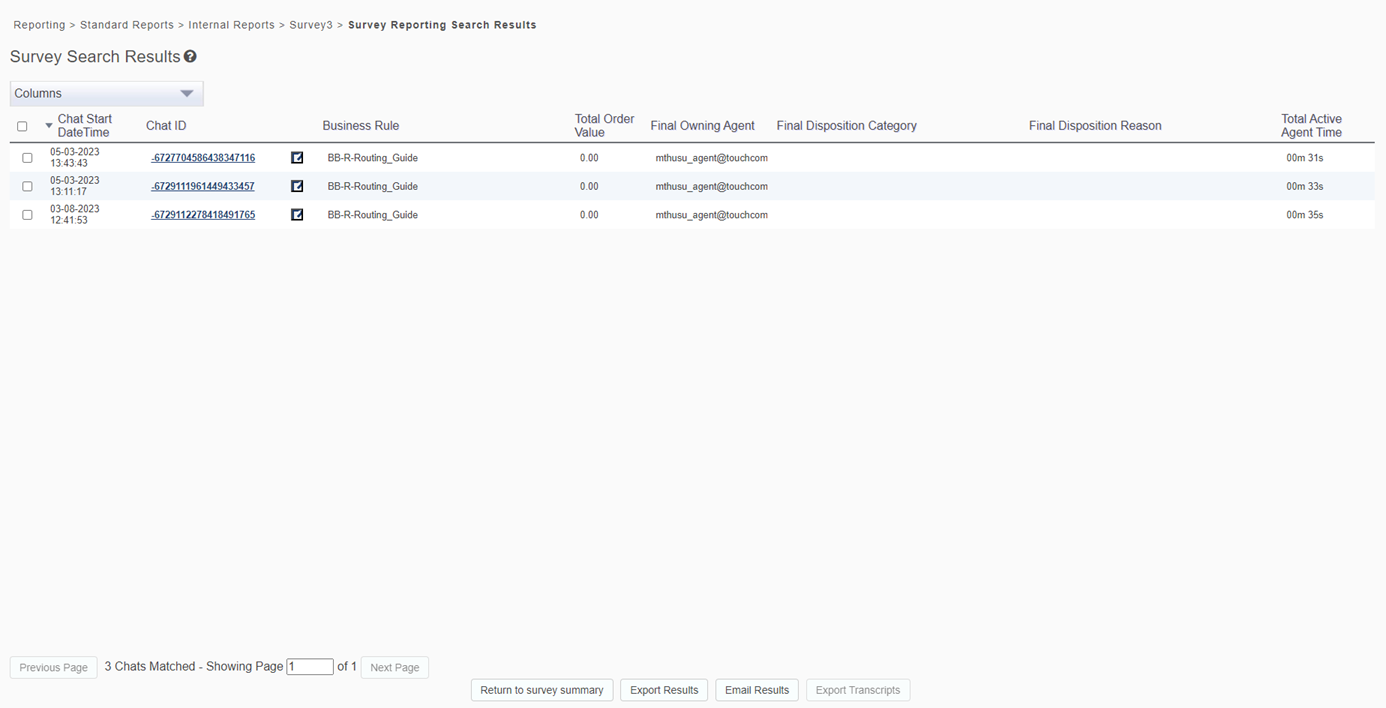 This view displays a list of engagements that had a survey with the selected answer(s). Chat IDs are presented in this table as links that you can click to display the Transcript Details page.