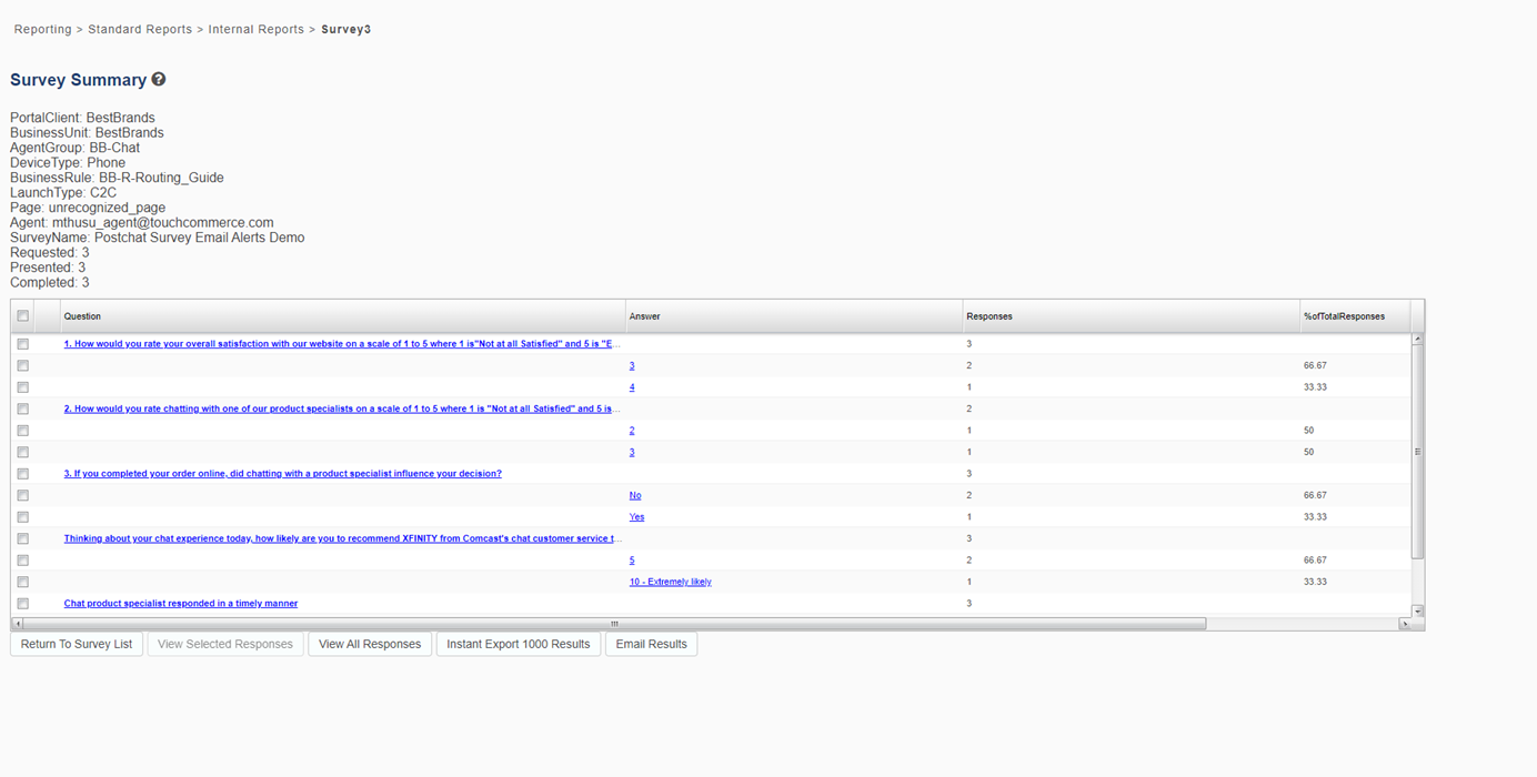 Requested: The number of surveys that were requested. A survey is defined as requested when the customer takes an action that results in the request of a survey. For example, when a customer closes the chat window, a survey is requested.