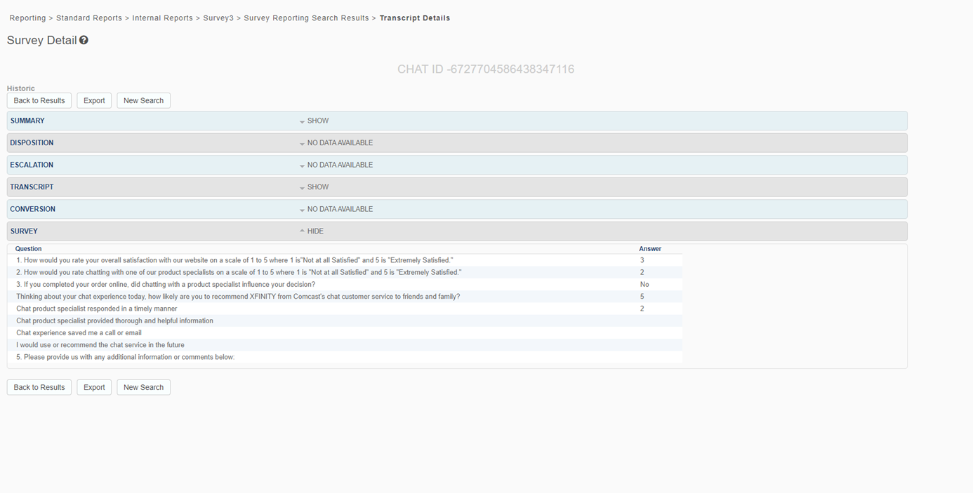 Click a Chat ID to open the Transcript Details view, which displays the survey section, showing both survey questions and answers.