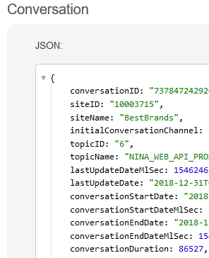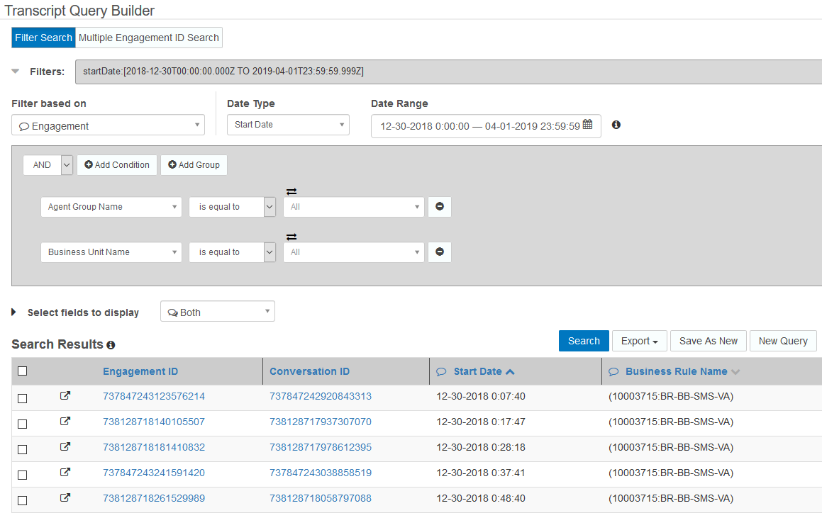 The Engagement ID and Conversation ID columns display as links in their table columns. When you click on a Conversation ID link, the search result data displays in JSON. Clicking on an Engagement ID link displays search results on a new page.