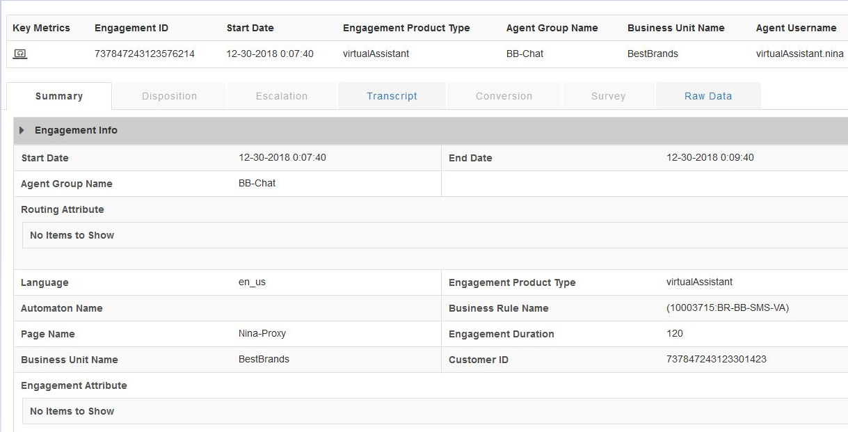 Engagement information is displayed in a summary table at the top of the page. The Key Metrics label icon indicates whether the engagement was handled by a virtual agent or a live agent. More details are displayed below in sections under tabs on the page. No matter which tab you are viewing, the summary table displays at the top.