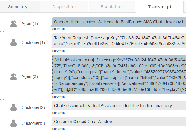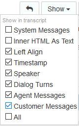 You can include or exclude system messages, timestamps and speaker icons. The Inner HTML as Text sets the hyperlinks to display a shorter domain name instead of the longer address including https:/ etc. If you clear the Left Align checkbox, the transcript displays the agent text on the left and the customer text is on the right, similar to an SMS message display. You can also display only agent or only customer messages or only system messages. The Dialog Turns option displays brackets that group customer lines with agent responses.