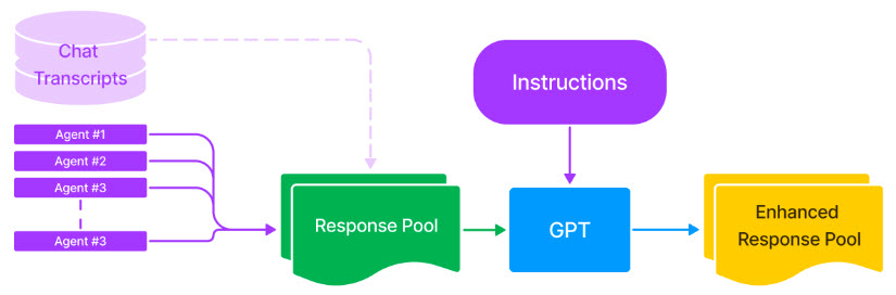 Agent Coach is a retrieval recommendation system that suggests relevant replies based on the chat history. Agents retrieve these replies from a response pool, which is a list of pre-set responses created during model training. The response pool consists of utterances gathered from chat transcripts that are frequently used by agents (for example, more than 10 to 100 times, depending on the volume). Despite using a model to fix such errors, these utterances are often riddled with typos and grammatical errors. Instead, administrators use a large language model (such as GPT) to correct typos and grammatical errors in all utterances included in the response pool.