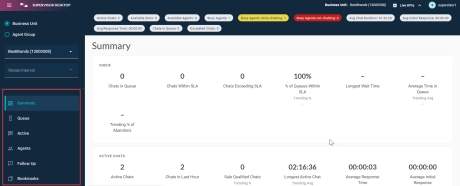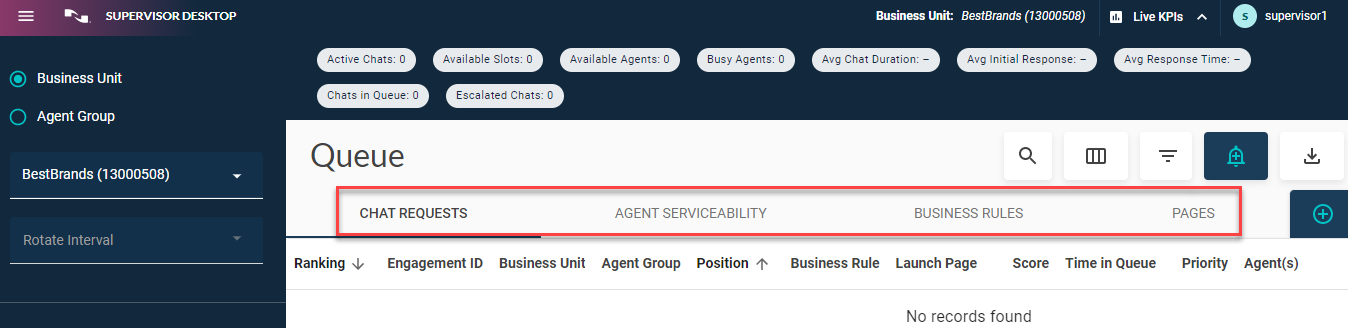 Supervisor Desktop has multiple data tabs, which enable easy monitoring of agents and chats. The views in each data tab are customizable. Users with the Supervisor Administrator role can add or remove columns, create new views, and set and manage alerts based on the client's service level agreements (SLA). Standard Supervisor users can create filters and use the search features to customize their view.