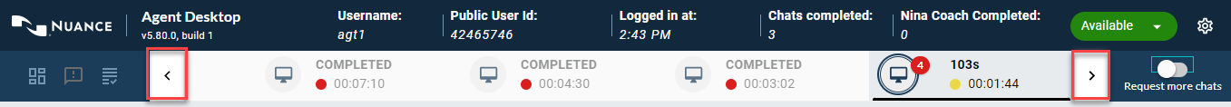 When an agent has more active engagement tabs than those shown in the Agent Desktop header, the scroll arrows appear on the sides. These arrows enable agents to scroll through and access engagement tabs that are currently hidden, enabling them to respond to customers more effectively.
