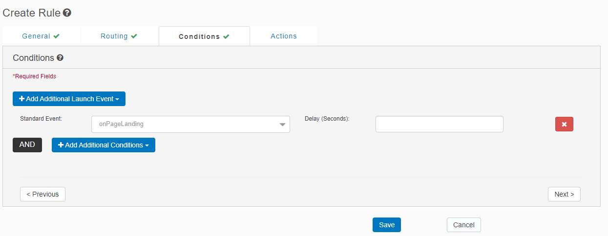 The Conditions tab of the Create Rule or Edit Rule page specifies the conditions for the business rule to launch a chat, survey, or other targeted content.