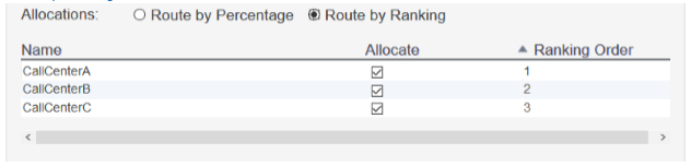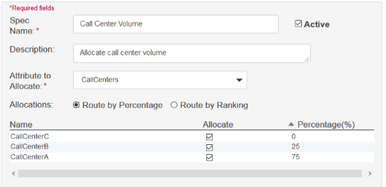Next, the client creates a Routing Allocation Spec named Call Center Volume Allocation. The Attribute to Allocate is set to CallCenters. The allocation for value CallCenterA is set to 75% and the allocation for value CallCenterB is set to 25%.