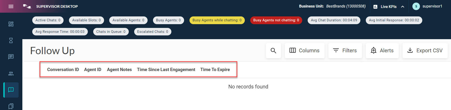 With asynchronous messaging conversations, agents using Agent Desktop can place conversations in a Follow Up state so they can respond to the customer later. This gives agents time to research, complete a process, gain approval, and so on. This tab allows you to monitor the engagements that require an agent response. The data displayed here reflects what is displayed to agents in the Follow Up tab in Agent Desktop.