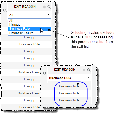 For the OUTCOME and EXITREASON columns, using the Search function allows you to display only those calls possessing a parameter value you select from a list.