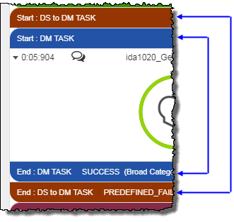 Visual task delimiters signifying the start and end of each task, as defined in the AFT file. The End delimiter displays the task name and information about the outcome at the Broad category level as well as the Detailed category level.