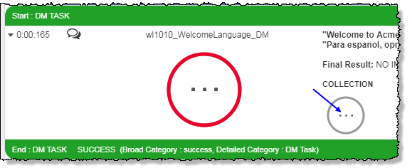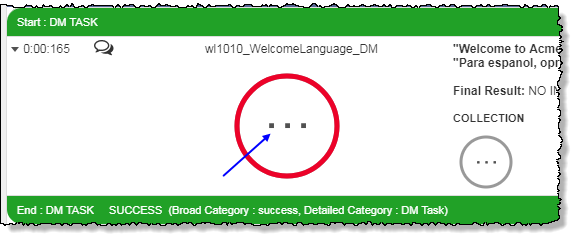 In the APPLICATION and MERGED tabs of Call View, the NO-INPUT-TIMEOUT DM status icon (ellipsis) is always surrounded by a red circle. In the RECOGNITION tab, the circle is gray. The figure inside the circle is an ellipsis (three dots). This status indicates the final outcome of the DM is that there was no input before the NO-INPUT-TIMEOUT period elapsed.