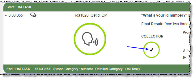 The presence of the lightning bolt symbol indicates that the caller in this particular collection attempt performed a barge-in, meaning the caller provided an utterance before the system finished asking a question. On the RECOGNITION tab, the barge-in icon is applicable on a per recognition event basis. For this reason, the icon appears with the input mode icon within the recognition event status circle.