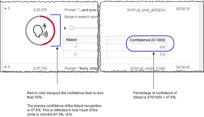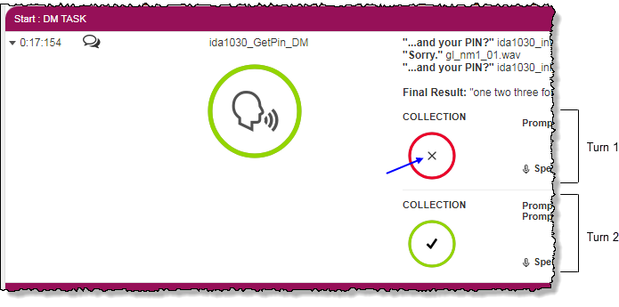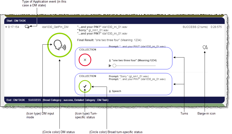 Turn-specific status information, inside the turn status icon (Call View) Recognition status from Dragon Voice component logs (APPLICATION and MERGED tabs of Call View) |