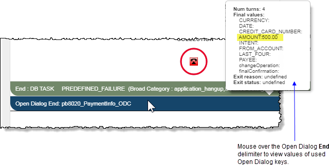 To support the added key values in Dragon Voice recognition and semantic interpretation, Nuance Insights uses Open Dialog dialog modules. Mouse over the Open Dialog Start delimiter to view available Open Dialog (OD) keys. Mouse over the Open Dialog End delimiter to view the OD keys used and the values assigned to them.