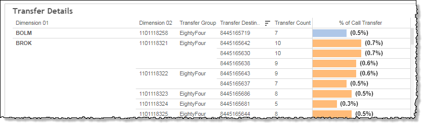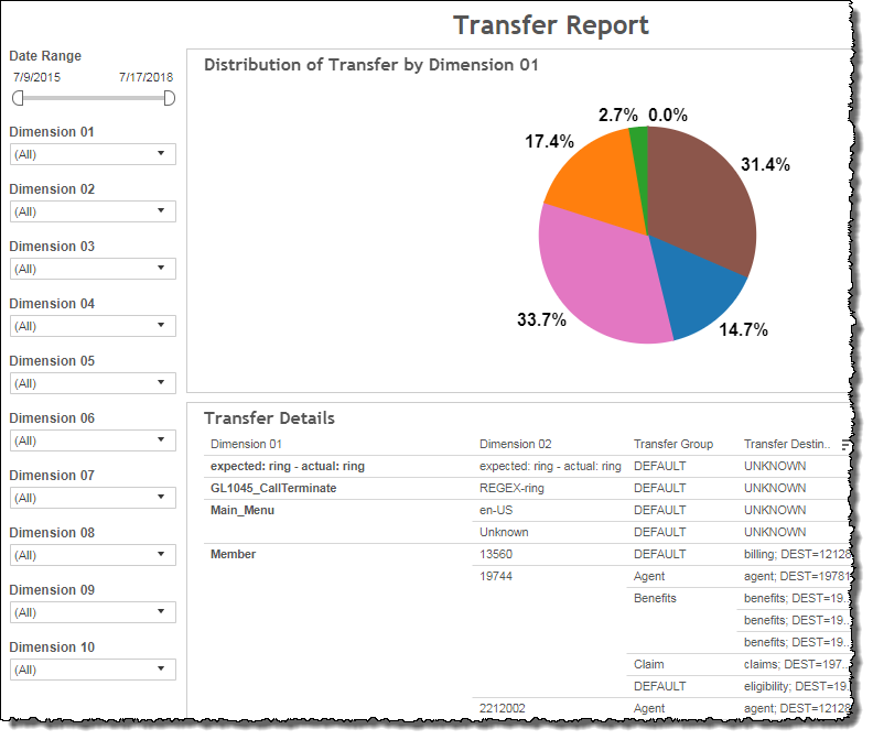 A transfer destination is a specific agent pool or agent transfer number. Typically this is a string of digits. for selected values of the Dimension 1 filter. The Dimension 1 filter in the report allows you to select one, several, or all Dimension 1 values.