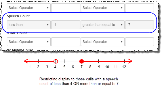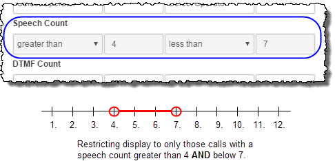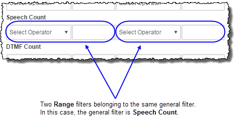 There are several filters within the Call Set Filter page that allow you to reduce the reported call data by restricting calls outside of a specified range. They are all in the Call Attributes area of the interface and include Duration in seconds, Speech Count, DTMF Count, No Match Count, No Input Count, Collection Count, and Confirmation Count. Each of these general filters includes two filters to allow you to specify beginnings and ends of the ranges you would like to see listed. When used in this way, one would typically select a greater than operator to go with the lowest limit of the range and a less than operator to go with the upper limit, thereby excluding all calls below and above the bracketed range. In this case, the relationship between the filter specifying the lower limit and the filter specifying the upper limit is characterized by an AND operator.