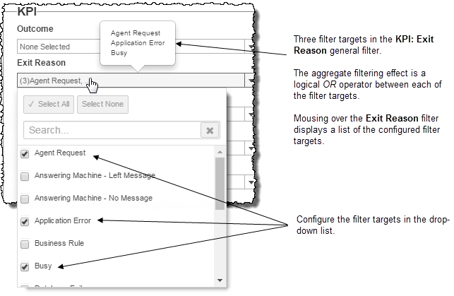 An example of this is the Has Audio check box and the ANI filter being configured. Both filter statements must be true in order for data to be reported.