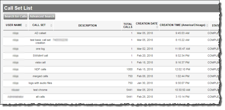Each row in Call Set List represents a Call Set. Clicking anywhere within a row (except in the UPDATE and DELETE columns) generates a call list based on the selected Call Set's filter criteria.