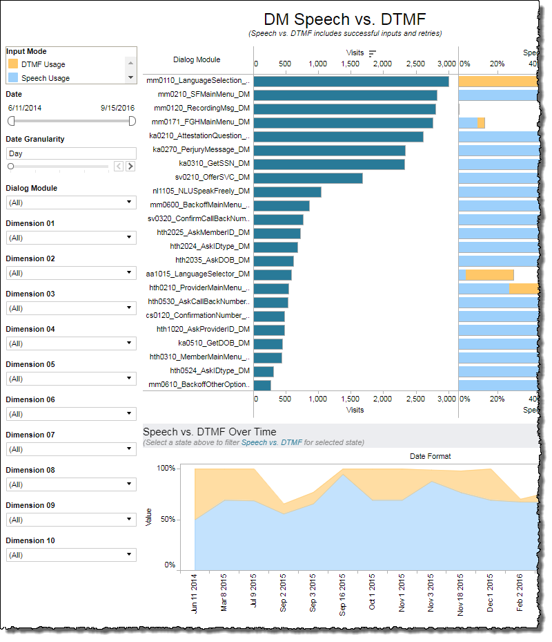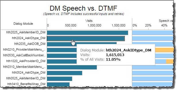 This graph has two components. The Visits (left-most) side of the chart is a simple numerical count of executions of individual Dialog Modules. Each row of the graph corresponds to a single Dialog Module. The Speech vs. DTMF (right-most) side of the chart breaks down each Dialog Module's group of visits into a visualization of the relative volume of each input mode to the overall whole.