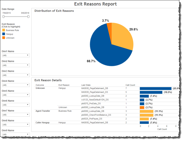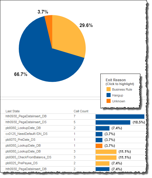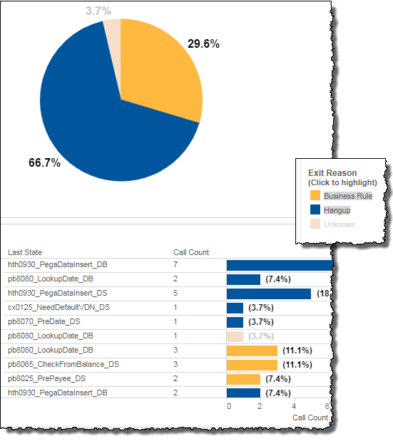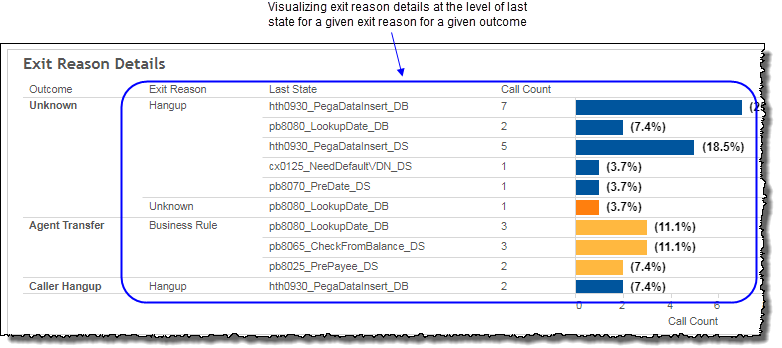 This graph presents details of the same data-set with Outcome as the independent variable. That is, you can view the frequency of an exit reason as a function of the outcome, breaking out call volumes by exit reason and further by last state.