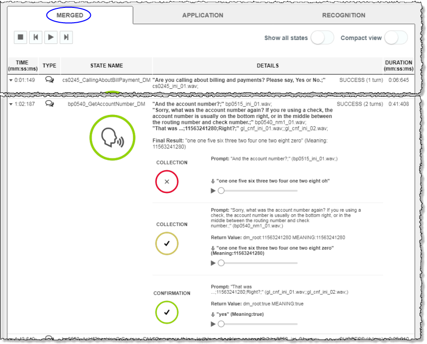 The MERGED tab represents the merging of data from the Application logs and the Recognition logs. This tab is visible only if both Application logs and Recognizer logs are generated using a Nuance suite of products, in particular, supported versions of Nuance Development Framework (NDF) and Nuance Recognizer or Dragon Voice components like Krypton Recognition Engine and Natural Language Engine must be the source of Recognition logs.