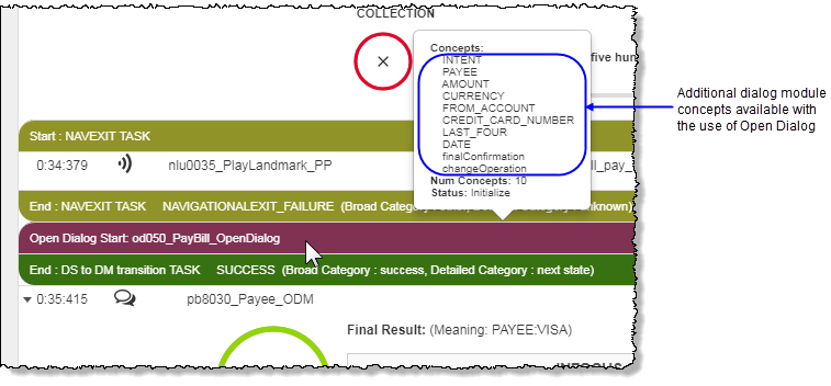 These values come from the In recognition logs, you may find there is more than one instance of a The following is a segment of a line from a recognition log in which concepts are defined:
