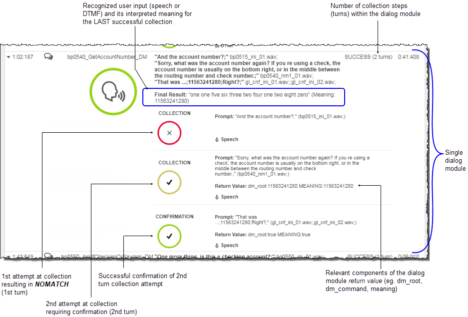 Application logs contain all information about a call except data associated with recognition. You can see a session's sequence of state occurrences, their respective state types, time stamps, durations, the task each state belongs to (if applicable), and the outcome (if the state is a Dialog Module).