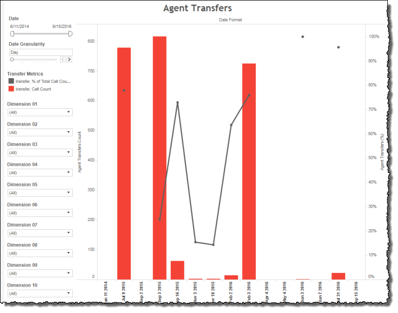 - A spike in raw count of transfers, with no change in ratio from the previous data point (day, week, month, quarter, or year, depending on the configured Date Granularity), indicates that overall call volume has increased, and that the application is transferring callers at the same rate as in the previous data point.